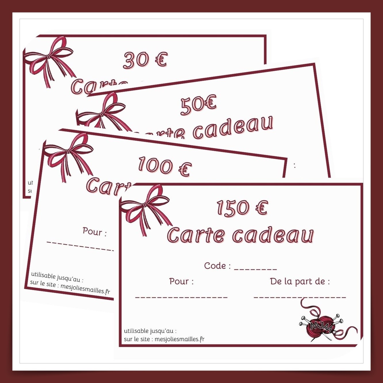 Le montant de la carte est utilisable en une ou plusieurs fois, sur l'intégralité de la boutique Mes Jolies Mailles.