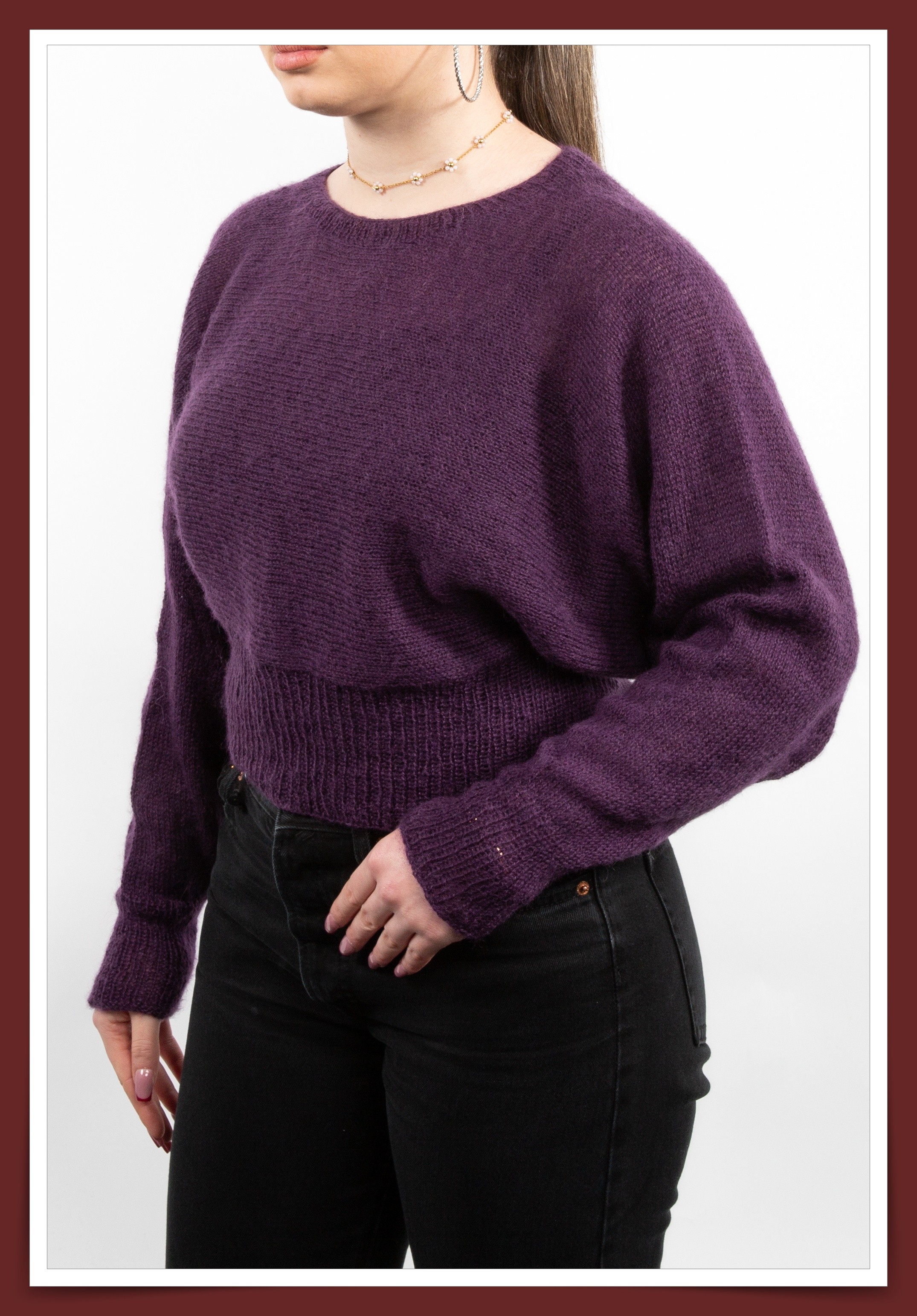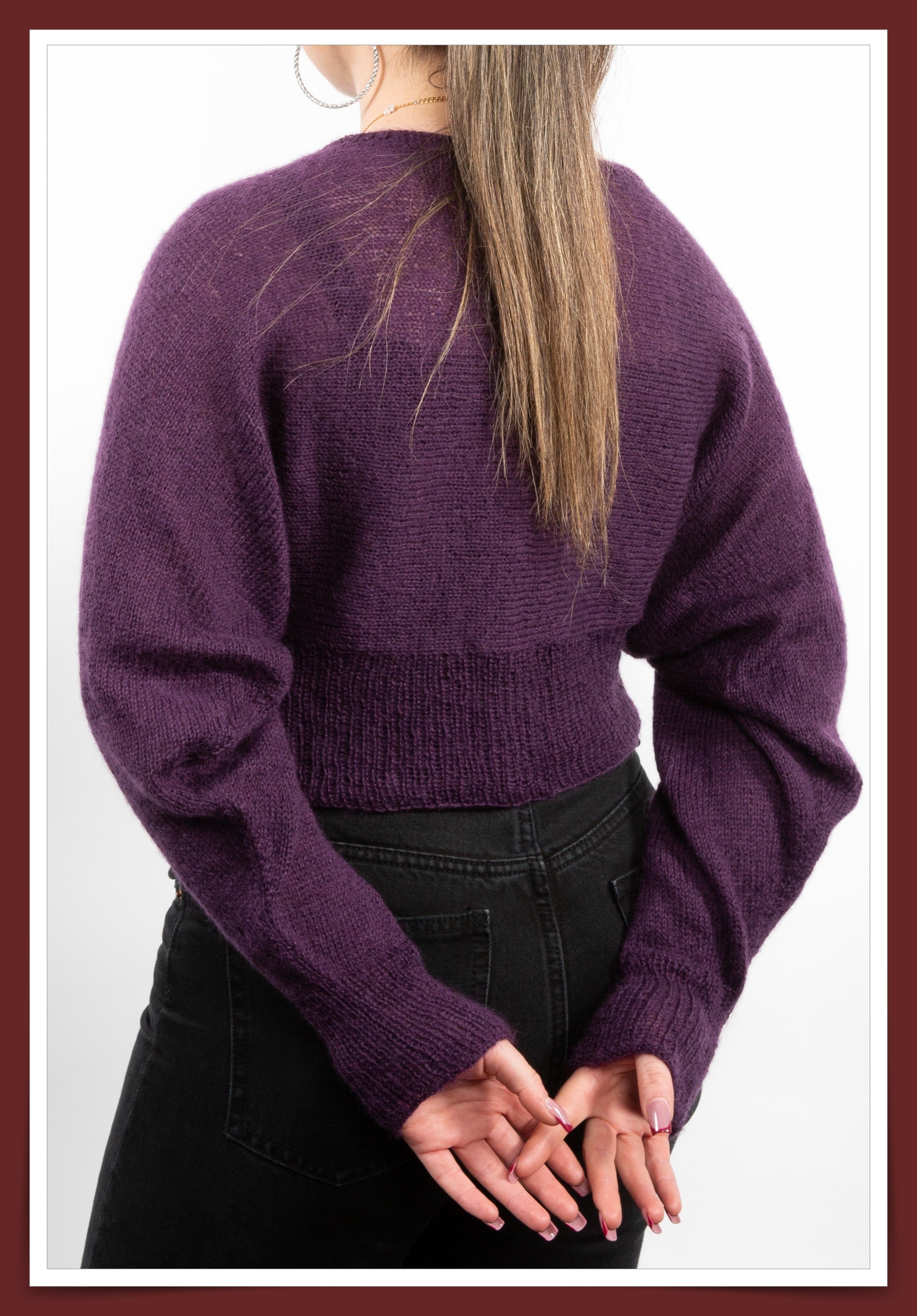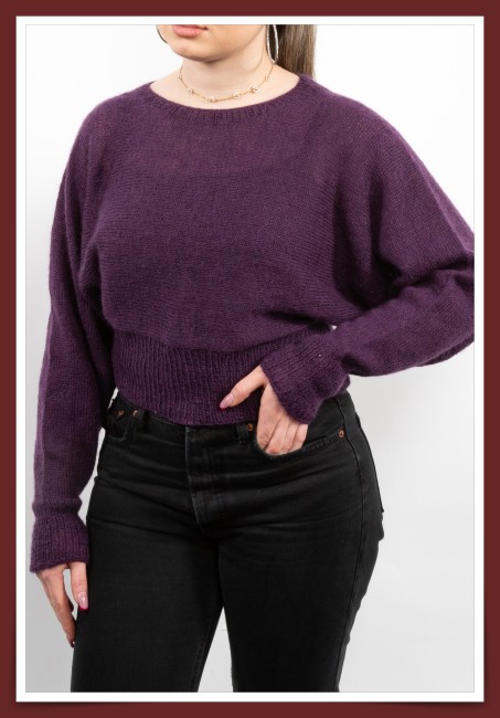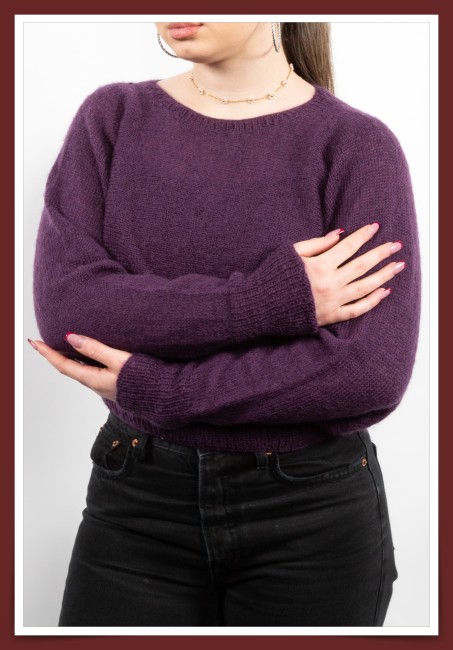 Tricoté à la main avec un fil duveteux et vaporeux. La maille est legère et fluide donnant un aspect mohair délicat à cet ouvrage.