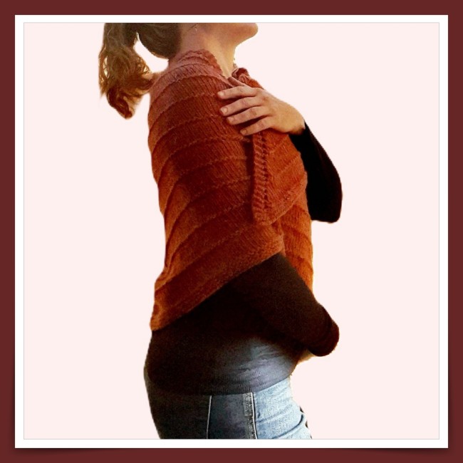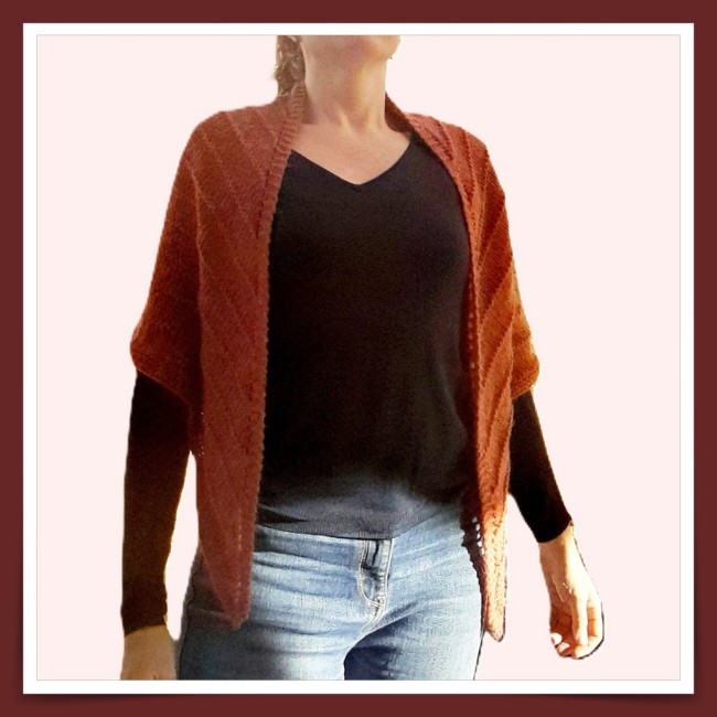De forme triangulaire, ce vêtement est travaillé en point fantaisie avec une rayure legère.